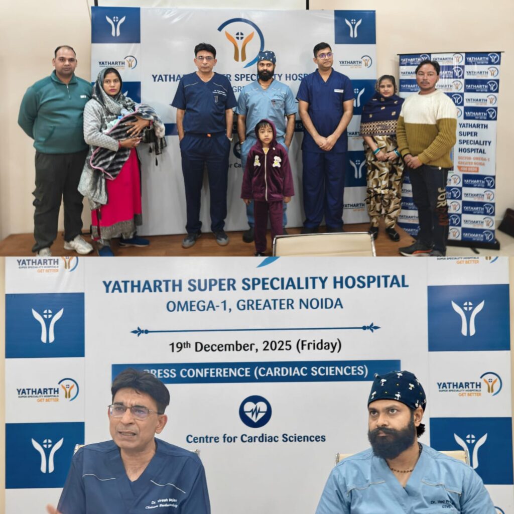 एनसीआर लाइव:ग्रेटर नोएडा, दिसंबर 19, 2025: यथार्थ सुपर स्पेशियलिटी हॉस्पिटल, ग्रेटर नोएडा में शुक्रवार को आयोजित प्रेस कॉन्फ्रेंस में दो जटिल बाल हृदय रोग मामलों की क्लीनिकल जानकारी साझा की गई। इस दौरान डॉक्टरों, देखभाल टीम और मीडिया प्रतिनिधियों ने जाना कि किस तरह समय पर किए गए जीवन बचाने वाले हृदय ऑपरेशनों ने एक 20 दिन के नवजात और एक 7 वर्ष के बच्चे की जिंदगी की दिशा बदल दी। इनसे पता चलता है कि तकनीकी रूप से बेहतरीन माहौल में भी चिकित्सा व्यवस्था के मानवीय गुण बने रहते हैं। ये सामान्य सर्जरी नहीं थीं। ये बेहद जोखिम भरे, सटीक समय पर किए गए प्रयास थे, जहां हर घंटे की अहमियत अमूल्य थी और यह बात वहां मौजूद हर व्यक्ति महसूस कर सकता था।
