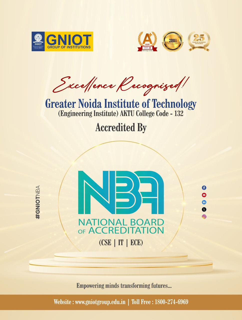 एनसीआर लाइव:ग्रेटर नोएडा नॉलेज पार्क स्थित जीएनआईओटी ग्रुप ऑफ इंस्टीट्यूशंस के अंतर्गत संचालित ग्रेटर नोएडा इंस्टीट्यूट ऑफ टेक्नोलॉजी (इंजीनियरिंग इंस्टीट्यूट) ने शैक्षणिक उत्कृष्टता की दिशा में एक महत्वपूर्ण उपलब्धि हासिल करते हुए नेशनल बोर्ड ऑफ एक्रिडिटेशन (एनबीए) से तीन प्रमुख शाखाओं में मान्यता प्राप्त की है।*