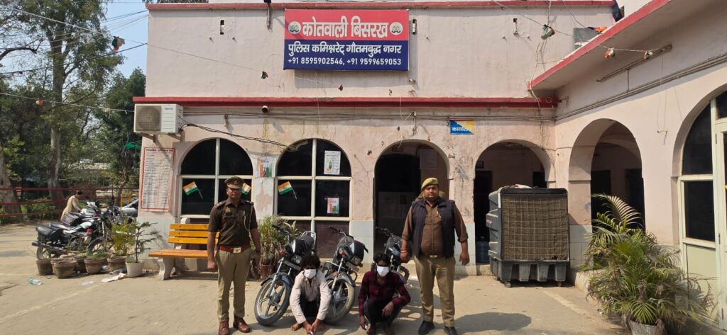 एनसीआर लाइव:सेंट्रल नोएडा दिनांक 23.02.2026 को थाना बिसरख पुलिस द्वारा लोकल इंटेलिजेंस व गोपनीय सूचना के आधार पर कार्रवाई करते हुए वाहन चोरी करने वाले 02 अभियुक्त 1. बाबू उर्फ शाजिद पुत्र मुनावर अली 2. प्रियांशु पुत्र रतन सिंह को डबल पुलिया चारमूर्ति के पास से गिरफ्तार किया गया है। अभियुक्तों के कब्जे/निशानदेही से चोरी की 03 मोटरसाइकिल, 01-01 अवैध चाकू बरामद किया गया है।
